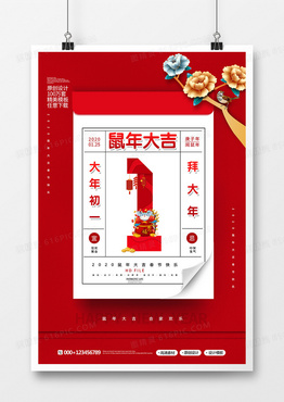 剪纸风创意2020春节大年初一拜大年海报