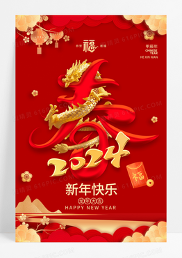 红色喜庆剪纸2024年龙年新年快乐宣传海报