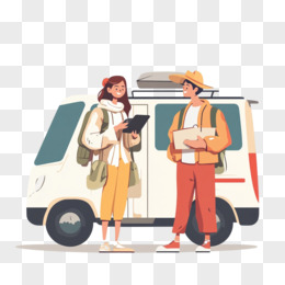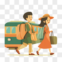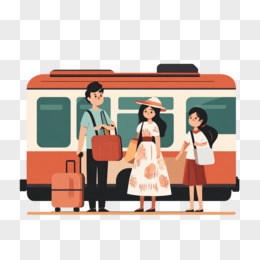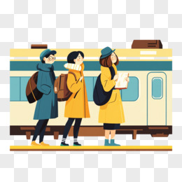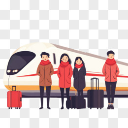 插画一排人戴着红色围巾站在高铁旁免抠元素