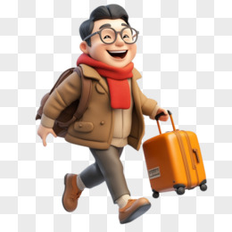 3D插画戴围巾眼镜的男人拉着行李箱免抠元素