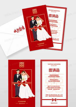 红色中式国潮插画婚礼婚庆邀请函结婚请帖婚礼请柬