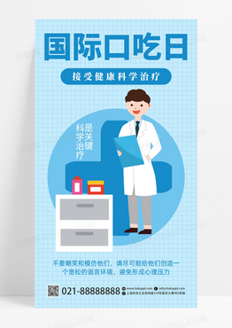 蓝色卡通国际口吃日接受健康科学治疗手机海报