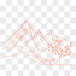 中式橘黄色线条山水和小树免抠元素