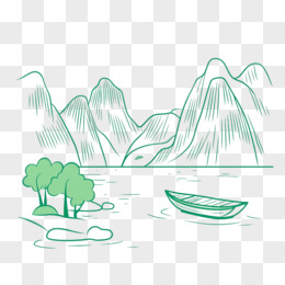 中式绿色线条山水和小船免抠元素