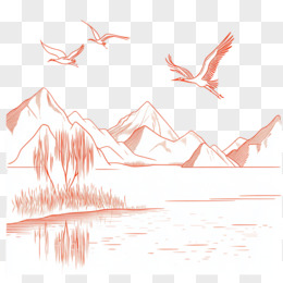 中式橘黄色线条山水和大雁免抠元素