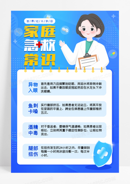 简约蓝色卡通家庭急救常识医疗宣传海报