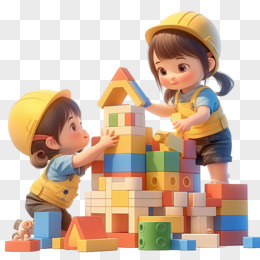 3D卡通两个小女孩在玩积木游戏免抠元素