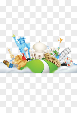 3D卡通男人拉着旅行箱站在地球前周围环绕各国景点免抠元素