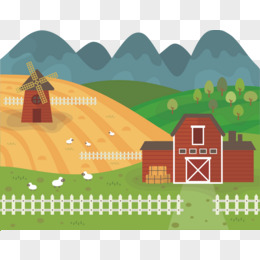 卡通矢量水车流水山峦景观素材