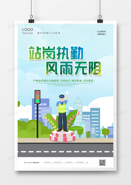 卡通手绘站岗执勤风雨无阻交通海报