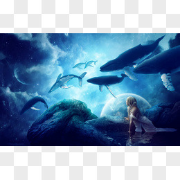手绘趴在鲸鱼背上睡觉的女孩素材