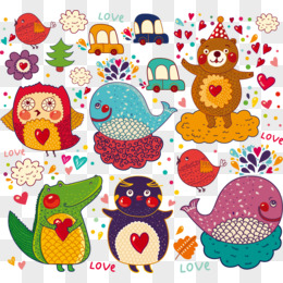 卡通手绘汽车树小鸟鲸鱼猫头鹰恐