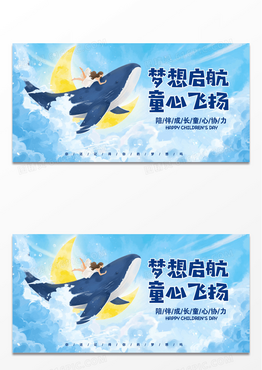 唯美治愈浅蓝色天空女孩与鲸鱼梦想启航童心飞扬展板设计
