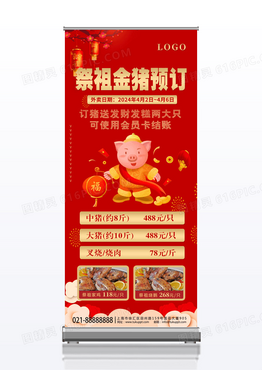 红色金色渐变背景酒店祭祖金猪预定活动展架清明烧猪金猪