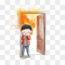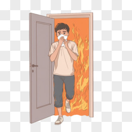 插画男孩捂着口鼻从着火的房间跑出来免抠元素