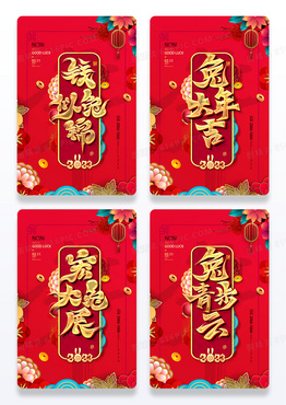 红色喜庆繁花似锦金色立体字兔年成语祝福春节组图海报