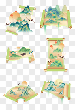 一组国潮风手绘书卷水墨山川插画套图合集元素