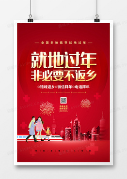 红色喜庆就地过年非必要不返乡春节防疫宣传海报