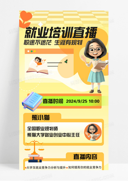 黄色简约就业培训直播生涯规划背景人物手机宣传海报长图