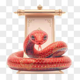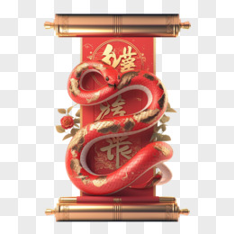3D立体新年红色蛇与红色中式卷轴免抠元素