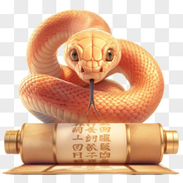 3D卡通新年橘黄色蛇和金色中式卷轴免抠元素