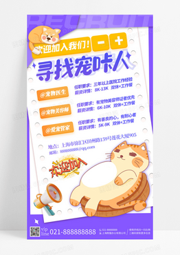 紫色插画寻找宠咔人宠物招聘手机宣传海报