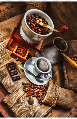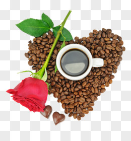 摆成心形的咖啡豆和咖啡及玫瑰花