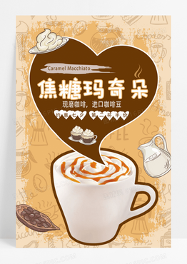 咖啡色卡通小清新焦糖玛奇朵咖啡饮品推荐海报