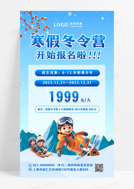 蓝色寒假冬令营开始报名啦寒假冬令营手机宣传海报设计