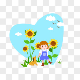 手绘可爱女孩儿童小狗向日葵郊游