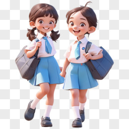 两个穿着校服的可爱小女孩背着书包去上学卡通3D元素