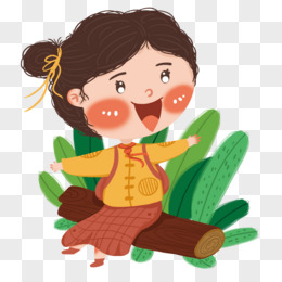 背着书包坐在木头草丛里打招呼的可爱女孩