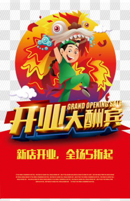 手绘男娃女娃舞狮欢迎开业大吉素材