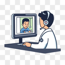 插画医生戴着耳机对着屏幕里的病人看病免抠元素