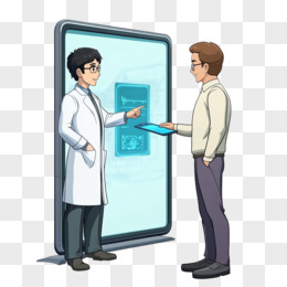 插画医生站在一个屏幕旁指引男人线上看病免抠元素