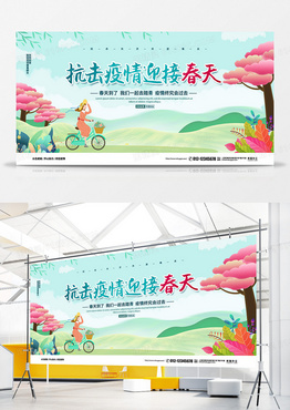 手绘插画简约抗击疫情迎接春天宣传展板设计