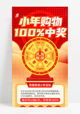 红色卡通2023年小年购物100中奖购物抽奖小年手机长图