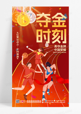 红色卡通夺金时刻巴黎奥运会钟过加油宣传手机海报