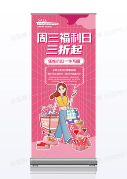 粉色卡通周三福利日百货商场促销宣传展架