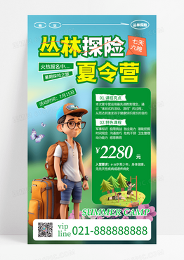 绿色卡通丛林探险夏令营暑假夏令营招生手机宣传海报