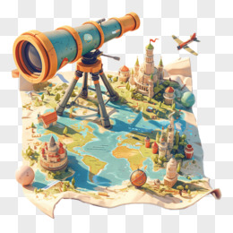 3D卡通一幅旅行地图和望远镜行免抠元素