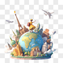 3D卡通穿长裙的女人站在表面都是知名建筑的地球免抠元素