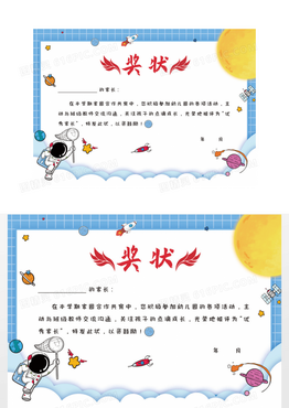蓝色简约卡通风宇航员幼儿园荣誉证书奖状