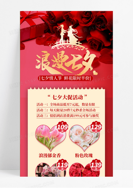 红色创意浪漫七夕鲜花优惠活动玫瑰花束ui手机海报长图
