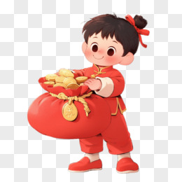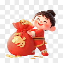 卡通新年装饰通用素材小朋友抱着大钱袋免抠元素