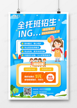 蓝色卡通可爱全托班招生海报