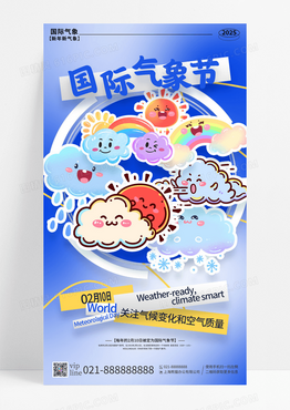 蓝色渐变卡通可爱天气表情国际气象节手机宣传海报