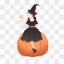 手绘卡通万圣节之坐在南瓜上的小女巫