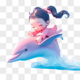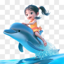 3D卡通风海洋日小女孩骑海豚在水面滑行免抠元素