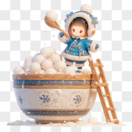 3D卡通小女孩站着大碗上面捞汤圆免抠元素